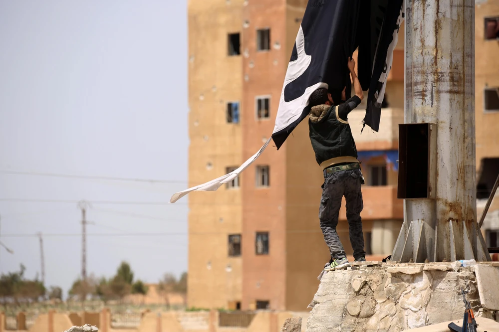 Một thành viên của SDF được Mỹ bảo trợ tháo cờ IS ở thị trấnTabqa, phía Tây TP Raqa, Syria. Ảnh: AFP