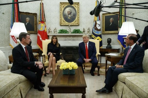 Vợ chồng Tổng thống Trump nói chuyện với Quyền Ủy viên FDA Ned Sharpless và Bộ trưởng Y tế Mỹ Alex Azar ngày 11-9. Ảnh: AP