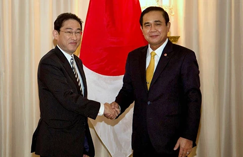 Bộ trưởng Ngoại giao Nhật Fumio Kishida (trái) yết kiến Thủ tướng Thái Lan Prayuth Chan-ocha ngày 2-5 tại Bangkok. Ảnh: REUTERS