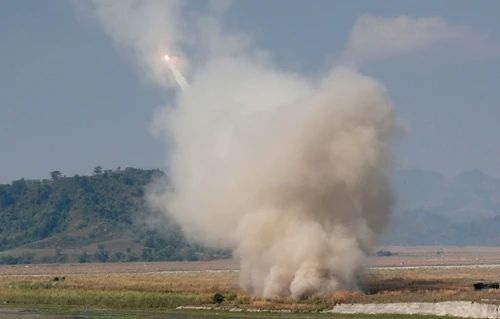 Hệ thống pháo phản lực cơ động cao (HIMARS) của Mỹ khai hỏa trong cuộc tập trận chung Balikatan với Philippines ở Capas, Tarlac, miền Bắc Philippines ngày 14-4. Ảnh: Reuters