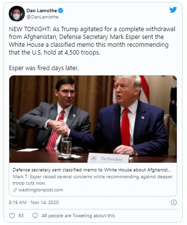 Phóng viên Dan Lamothe của tờ The Washington Post tiết lộ khi ông Trump “quyết định rút quân hoàn toàn khỏi Afghanistan”, cựu Bộ trưởng Esper đã gửi cho Nhà Trắng bản ghi chú khuyến nghị chính phủ Mỹ giữ nguyên số quân tại quốc gia Trung Á này ở mức 4.500 quân. Nhiều ngày sau đó, ông bị sa thải.