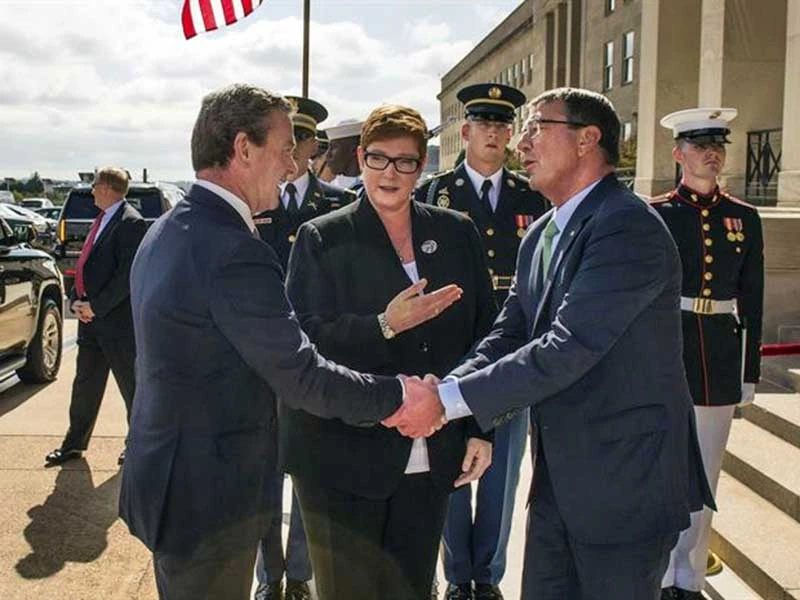 Bộ trưởng Quốc phòng Mỹ Ashton Carter đón người đồng cấp Úc Marise Payne(giữa) và Bộ trưởng Công nghiệp quốc phòng Úc Christopher Pyne. Ảnh: BỘ QUỐC PHÒNG MỸ