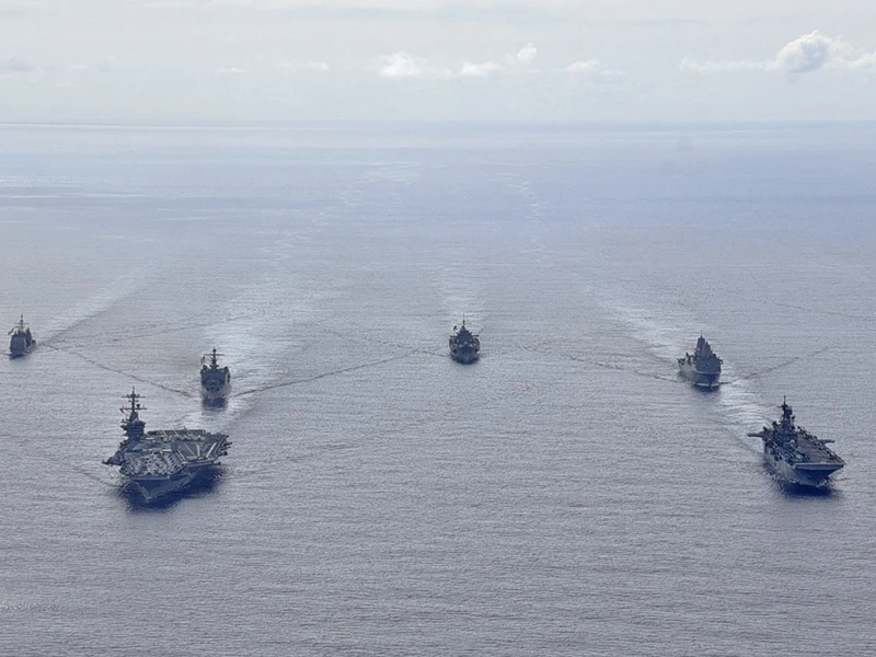 Nhóm tác chiến tàu sân bay Ronald Reagan và tàu đổ bộ USS Blue Ridge di chuyển qua vùng biển Philippines vào tháng 3. Ảnh: AP
