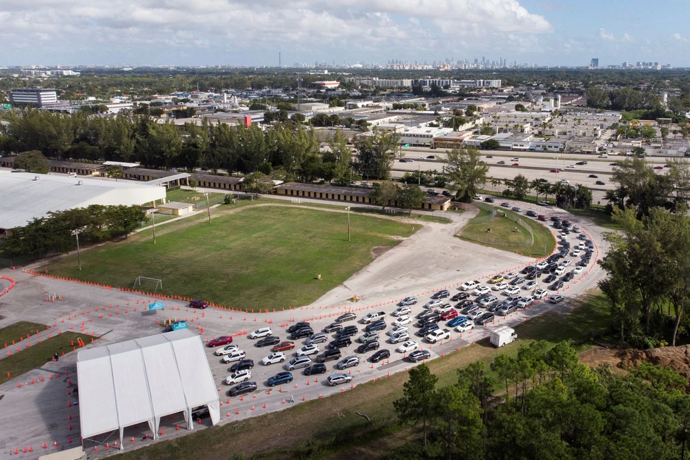 Đoàn xe của những người chờ xét nghiệm COVID-19 tại một điểm xét nghiệm lưu động ở TP Miami, bang Florida, Mỹ hôm 17-12. Ảnh: REUTERS