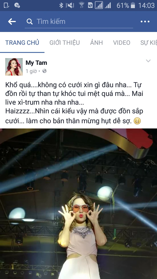 “Khổ quá... không có cưới xin gì đâu nha... Tự đồn rồi tự than tự khóc tui mệt quá mà... Mai live xì-trum nha nha nha... Haizzzz... Nhìn cái kiểu vậy mà được đồn sắp cưới... làm cho bản thân mừng hụt dễ sợ”, chị đã chia sẻ như vậy trên trang fanpage của mình.