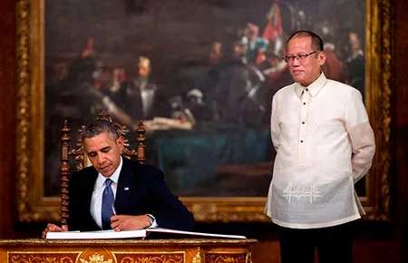 Lễ đón tiếp trọng thể diễn ra ở dinh tổng thống với 21 phát súng đại bác chào mừng. Tổng thống Benigno Aquino và Tổng thống Obama đã hội đàm riêng và tham dự cuộc họp song phương mở rộng.