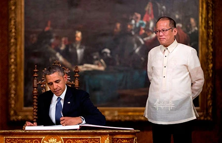 Ngày 28-4, Tổng thống Obama ký sổ lưu niệm tại dinh tổng thống với sự chứng kiến của Tổng thống Benigno Aquino. Ảnh: AP