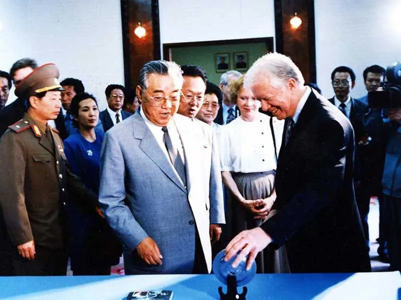 Chủ tịch Triều Tiên Kim Nhật Thành và cựu Tổng thống Mỹ Jimmy Carter(phải)tại Bình Nhưỡng tháng 6-1994. Ảnh: THE CARTER CENTER