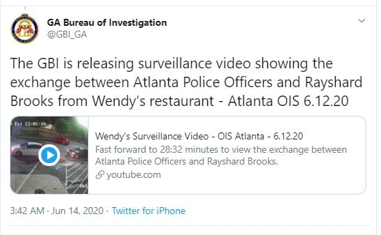 Twitter của GBI công bố đoạn phim ghi lại sự việc giữa thanh niên da màu Brooks và cảnh sát bên ngoài nhà hàng Wendy's. Ảnh: TWITTER