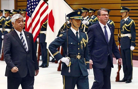 Bộ trưởng Quốc phòng Nhật Gen Nakatani nghênh đón người đồng cấp Mỹ Ashton Carter ngày 8-4 tại Tokyo. Ảnh: REUTERS