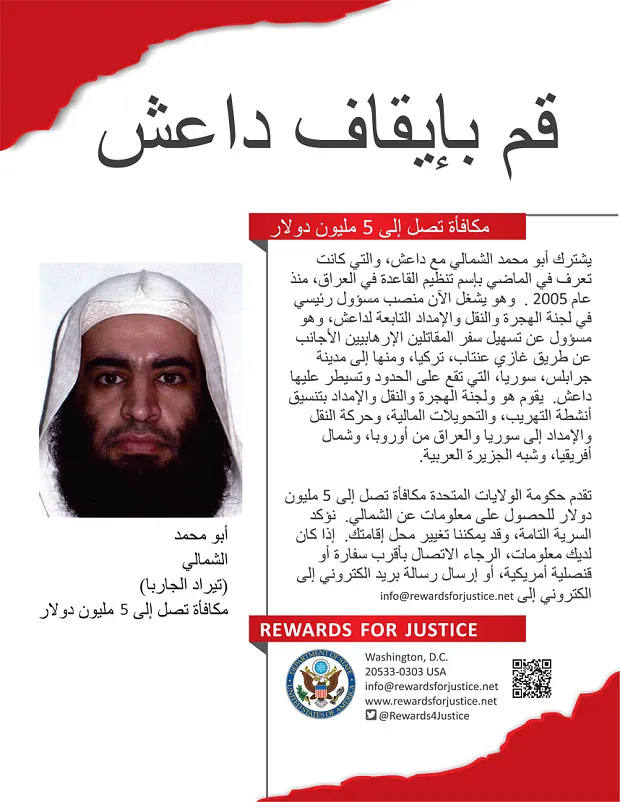 Chi tiết thông báo này được đăng trên website của Bộ Tư pháp Mỹ, kèm theo hình ảnh của Al-Shimal và phần thưởng được treo. Bộ Ngoại giao Mỹ đã xác định Abu-Muhammad al-Shimali, 36 tuổi, công dân Ả Rập, là kẻ chủ mưu đắc lực cho “ủy ban di trú và hậu cần” nhóm thánh chiến có vai trò giao dịch với các tình nguyện viên nước ngoài.