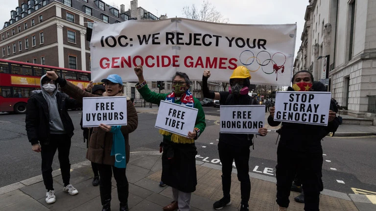 Các nhà hoạt động nhân quyền biểu tình bên ngoài Đại sứ quán Trung Quốc ở London, Anh, ngày 3-2. Ảnh: RT