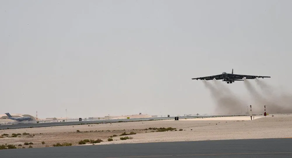 Chiếc oanh tạc cơ B-52H của Mỹ cất cánh từ căn cứ Không quân Al Udeid ở Qatar hôm 12-5. Ảnh: SPUTNIK