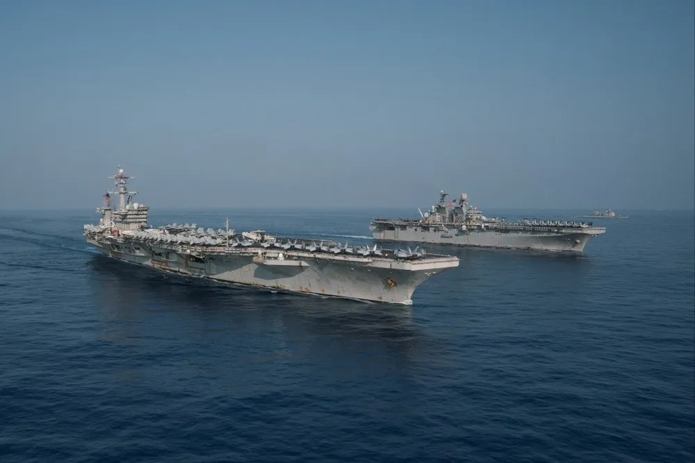 Nhóm tác chiến tàu sân bay Theodore Roosevelt di chuyển cùng Nhóm tác chiến tàu đổ bộ Makin Island ở Biển Đông hồi tháng 4. Ảnh: POLITICO