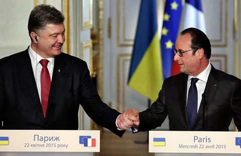 Trong khi đó, AFP đưa tin ba ngày trước khi gặp Tổng thống Nga Putin ở Yerevan (Armenia), hôm 22-4 tại Paris, Tổng thống Pháp François Hollande đã đón tiếp Tổng thống Ukraine Petro Poroshenko (ảnh).