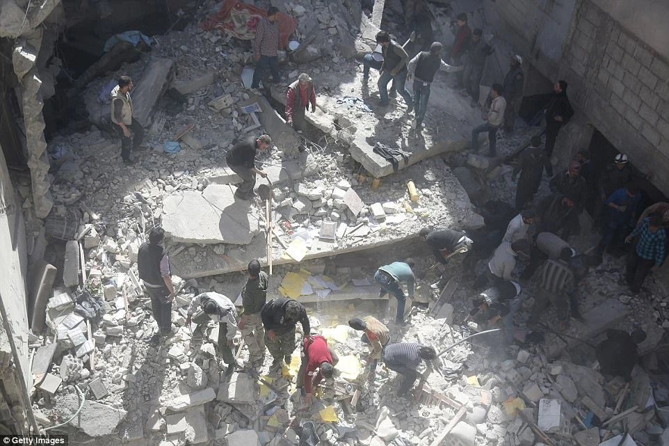 Lực lượng cứu hộ tìm kiếm những người sống sót trong một cuộc không kích ở thị trấn Saqba ở Đông Ghouta, Damascus, Syria. Ảnh: Getty Images