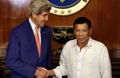 Tổng thống Rodrigo Duterte và Ngoại trưởng John Kerry tại Manila ngày 27-7. Ảnh: AFP