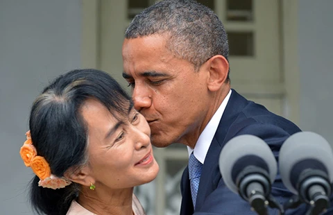 Khoảng khắc thân mật giữa ông Obama và bà Suu Kyi trong chuyến viếng thăm đến Myanmar năm 2014 (Ảnh: AFP)
