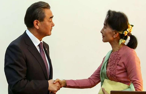 Bà Suu Kyi bắt tay Bộ trưởng Ngoại giao Trung Quốc Vương Nghị trong cuộc gặp ngày 5-4. Ảnh: REUTERS