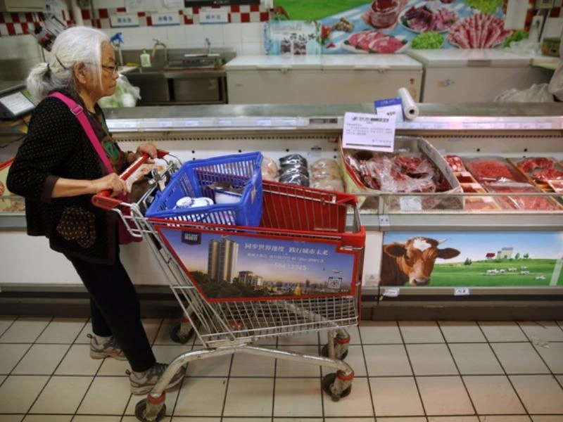 Một phụ nữ đẩy xe đựng hàng băng qua một gian bán thịt bò được sản xuất nội địa của Trung Quốc trong một siêu thị ở thủ đô Bắc Kinh ngày 12-5-2017. Ảnh: AP