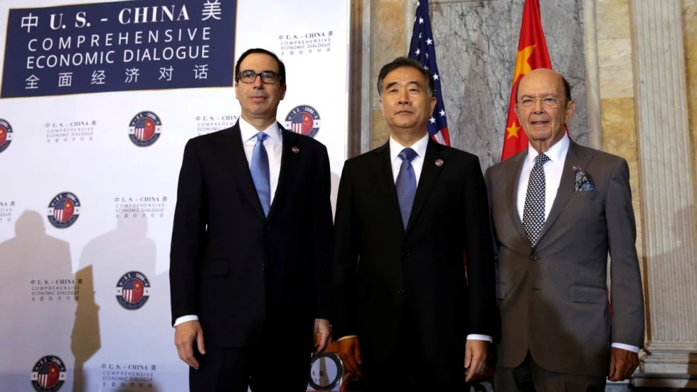 Từ trái qua: Bộ trưởng Tài chính Mỹ Steven Mnuchin, phó Thủ tướng Trung Quốc Uông Dương, Bộ trưởng Thương mại Mỹ Wilbur Ross tại Đối thoại Kinh tế toàn diện Mỹ-Trung hôm 19-7. Ảnh: SCMP