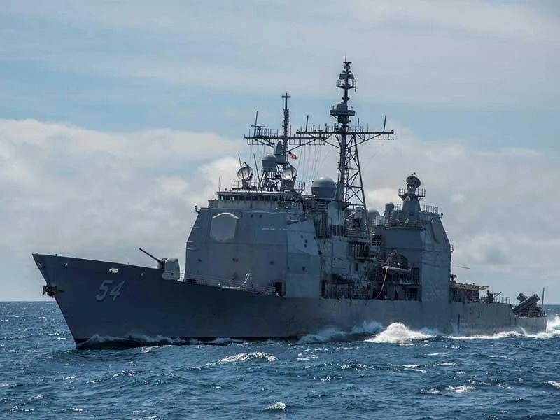 tuần dương hạm mang tên lửa dẫn đường USS Antietam của Mỹ được nhìn thấy trên biển Đông năm 2016. Ảnh: REUTERS