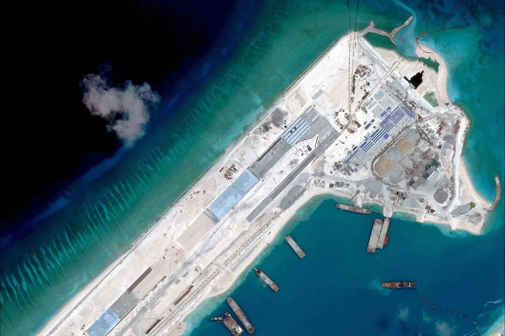 Hình ảnh vệ tinh cho thấy Trung Quốc đang xây trái phép một đường băng ở bãi đá Chữ Thập trên biển Đông (Ảnh: Getty Images)