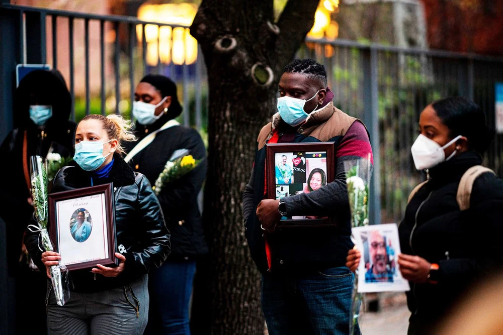 Các nhân viên y tế cầm di ảnh các đồng nghiệp tử vong vì COVID-19 bên ngoài BV Mount Sinai ở TP New York, Mỹ ngày 10-4. Ảnh: CNN