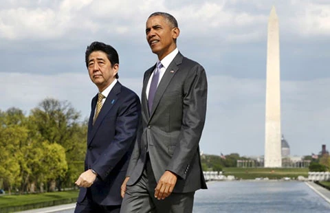 Tổng thống Obama và Thủ tướng Shinzo Abe viếng đài tưởng niệm Lincoln tại Washington ngày 27-4. Ảnh: REUTER