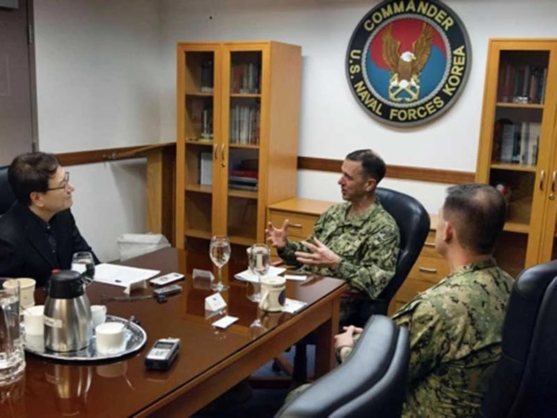 Đô đốc Richardson trả lời cuộc phỏng vấn sau khi ông đã dự họp với tướng Vincent K. Brooks (Chỉ huy quân đội Mỹ tại Hàn Quốc), tướng Jeong Kyeong-doo (Chủ tịch Hội đồng Tham mưu trưởng liên quân Hàn Quốc) và Đô đốc Um Hyun-seong (Tư lệnh hải quân Hàn Quốc).