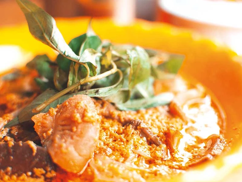 Khác hẳn với phá lấu bò hoặc heo, nước dùng của món phá lấu dê có vị bùi bùi, beo béo, ngầy ngậy, thơm thơm của nước cốt dừa. Ngoài ra, “huynh đệ” gắn bó với món này có chao, nước sốt hoặc nước me luôn đi kèm làm nước chấm để món ăn được dậy mùi hơn, vị đậm đà hơn. Nước me, nước sốt đậm nhưng lại không quá chua, ai cũng dùng được. Vừa trang trí, vừa dùng làm rau ăn kèm không thể thiếu là vài cọng rau răm để lên trên mặt tô phá lấu. Như vậy, nhìn tổng thể thì món này cũng chẳng thua kém bất cứ món ăn sang trọng nào khi có đầy đủ hương và sắc.