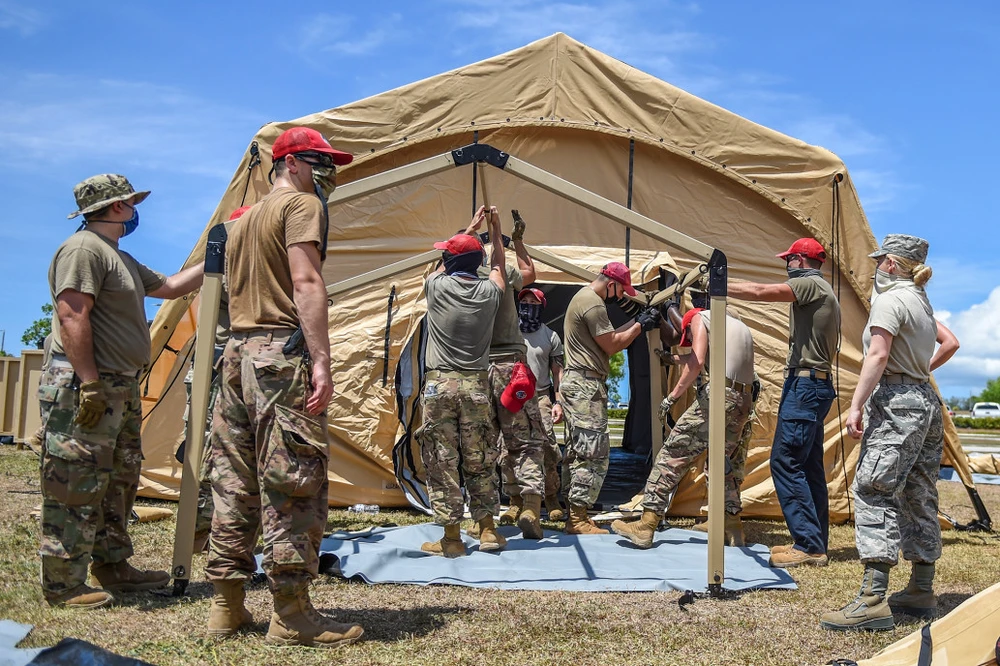 Các binh sĩ thuộc phi đoàn số 554-Red Horse hỗ trợ dựng cơ sở EMEDS trên đảo Guam. Ảnh: EPA/NEW YORK POST
