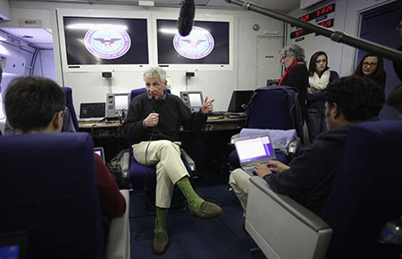 Bộ trưởng Quốc phòng Mỹ Chuck Hagel phát biểu với báo chí trên chuyến bay đến Hawaii ngày 1-4. Ảnh: AP