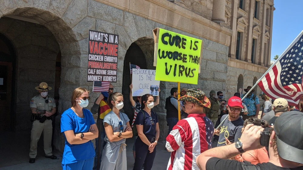 Các nữ y tá ngăn người biểu tình trước tòa nhà nghị viện bang Arizona (Mỹ) cuối tuần rồi. Ảnh: AFP