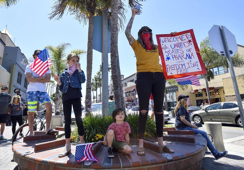 Người mẹ mang theo các con biểu tình ở TP Huntington Beach, bang California (Mỹ) ngày 17-4. Ảnh: GETTY IMAGES