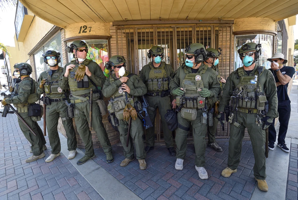 Cảnh sát giám sát biểu tình ở TP Huntington Beach, bang California (Mỹ) ngày 17-4. Ảnh: GETTY IMAGES