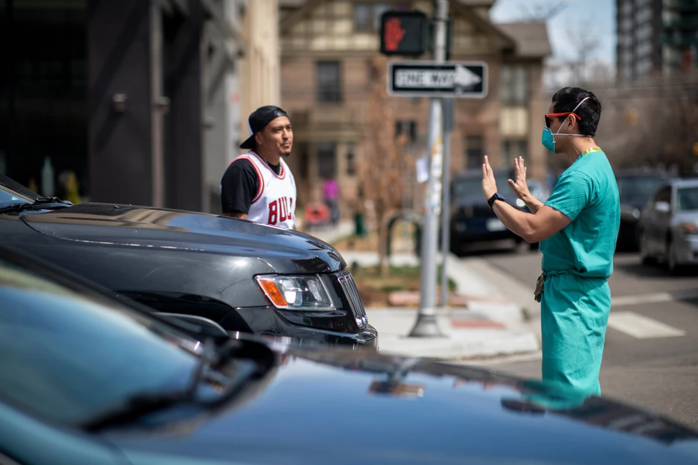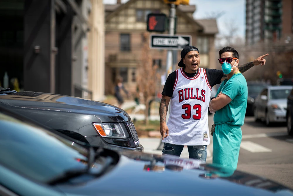 Bức ảnh đang được lan truyền rộng rãi chụp lại cảnh một nam y tá đứng ở vạch đi bộ chặn dòng xe của những người biểu tình phản đối lệnh đóng cửa vì COVID-19, tại TP Denver, bang Colorado (Mỹ). Ảnh do nhiếp ảnh gia ALYSON MCCLARAN chụp lại