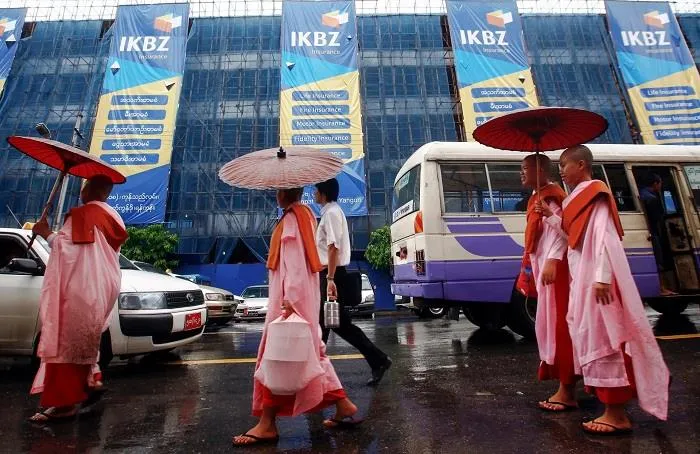 Các ni sư đang đi qua tòa nhà của Công ty bảo hiểm IKBZ Insurance ở Yangon. Thị trường bảo hiểm của Myanmar hiện rất nhỏ, nhưng sẽ bùng nổ trong thập niên tới. (Ảnh: Reuters)