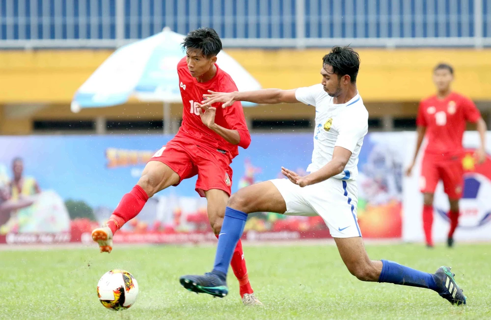 U-21 Myanmar (áo đỏ) bất ngờ loại ứng viên U-21 Malaysia. Ảnh: ANH HÒA