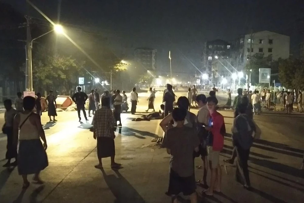 Người dân Myanmar đứng bên ngoài và tụ tập biểu tình trên một con đường ở thị trấn Insein ở Yangon vào ngày 8-3. Ảnh: AP
