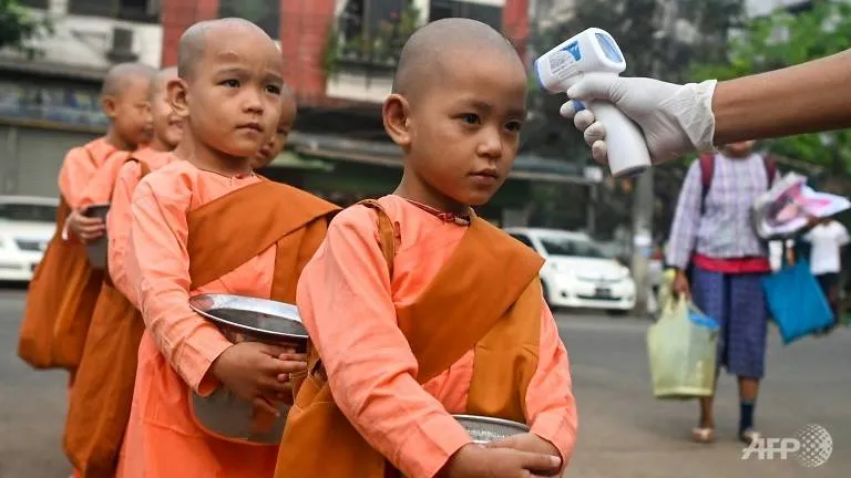 Các chú tiểu được kiểm tra nhiệt độ trên đường phố Yangon (Myanmar). Ảnh: AFP