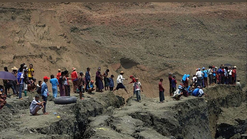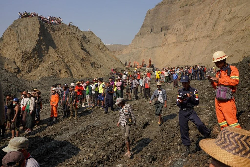 Người dân tập trung tại hiện trường mỏ khai thác ngọc bích bị sập vì bùn lở ở thị trấn Phakant, bang Kachin (Myanmar) ngày 23-4. Ảnh: REUTERS
