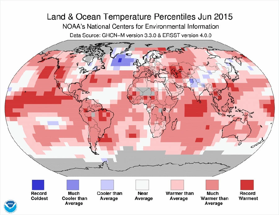 Bản đồ phân bố nhiệt độ toàn cầu tháng Sáu năm 2015 của NOAA. Nguồn: RT