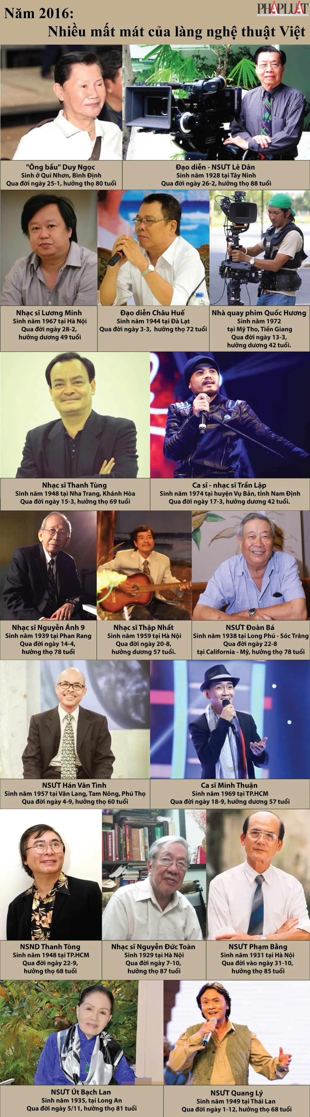 (PLO)- 2016 là năm "ra đi" của nhiều nghệ sĩ Việt Nam. Trong đó có nhiều nghệ sĩ gạo cội, NSƯT, NSND...