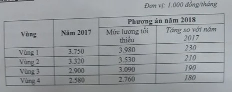 Cụ thể, mức tăng 180.000-230.000 đồng tùy theo từng vùng. Như vậy, từ vùng I đến vùng IV lần lượt là 3,98 triệu; 3,53 triệu; 3,09 triệu và 2,76 triệu đồng.