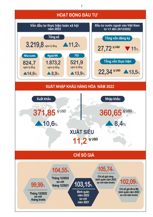 Kim ngạch xuất khẩu tăng tăng 23,6% so với năm 2021. Đồi sống dân cư và an sinh xã hội được đảm bảo.