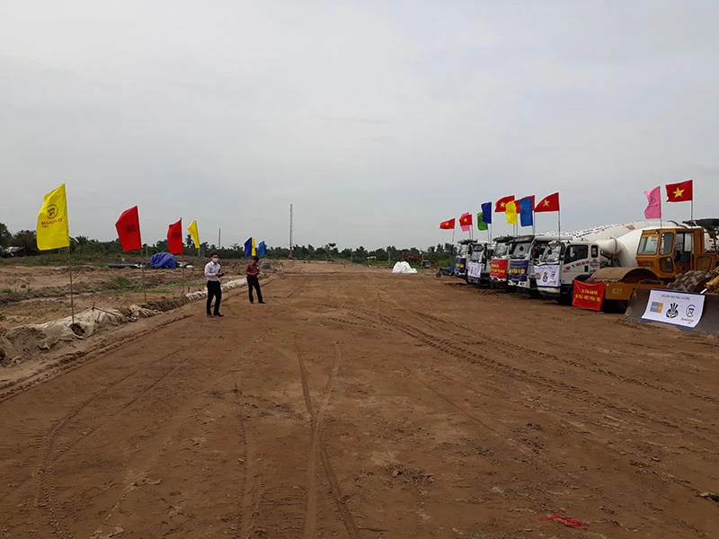 Công trường chuẩn bị triển khai thi công với hàng xe công trình xếp hàng dài. Ảnh: KIÊN CƯỜNG