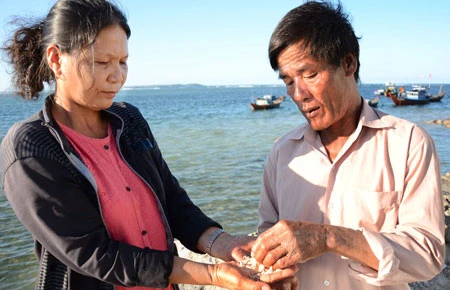 Nắm cát Hoàng Sa trên tay vợ chồng ông Thạch.