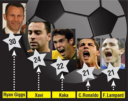 Lionel Messi không có tên trong năm người nhưng lại về thứ 10 trong danh sách những người kiến tạo hay nhất gồm 19 lần thành công.