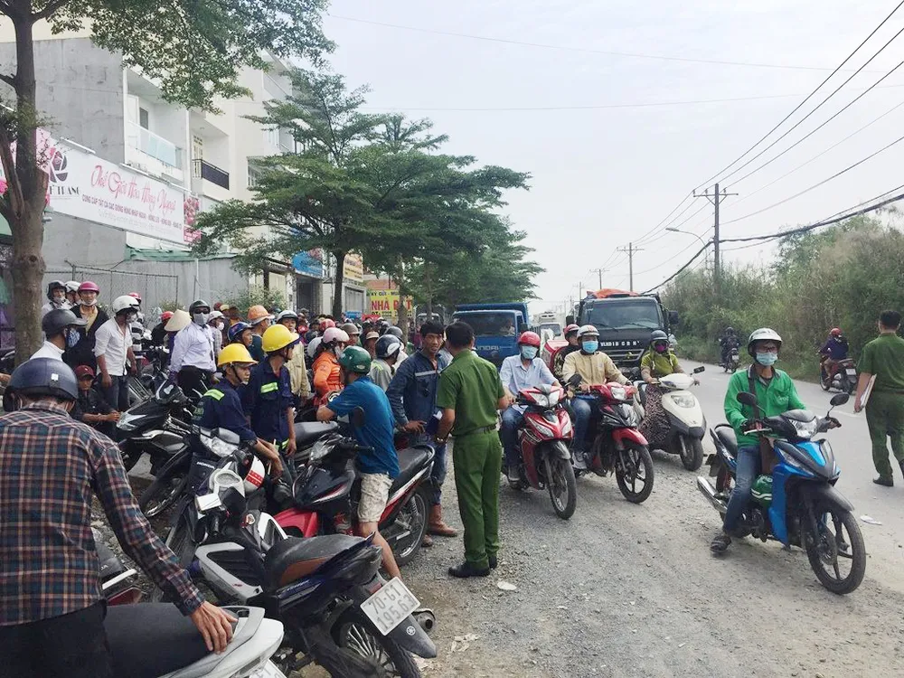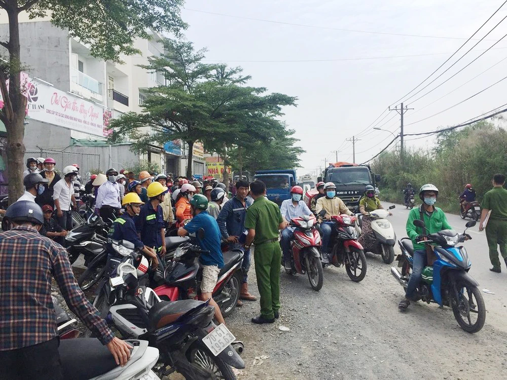 Tại hiện trường, chiếc xe máy cùng nạn nhân nằm dưới gầm xe ben trên phần đường hướng đi ra xa lộ Hà Nội.